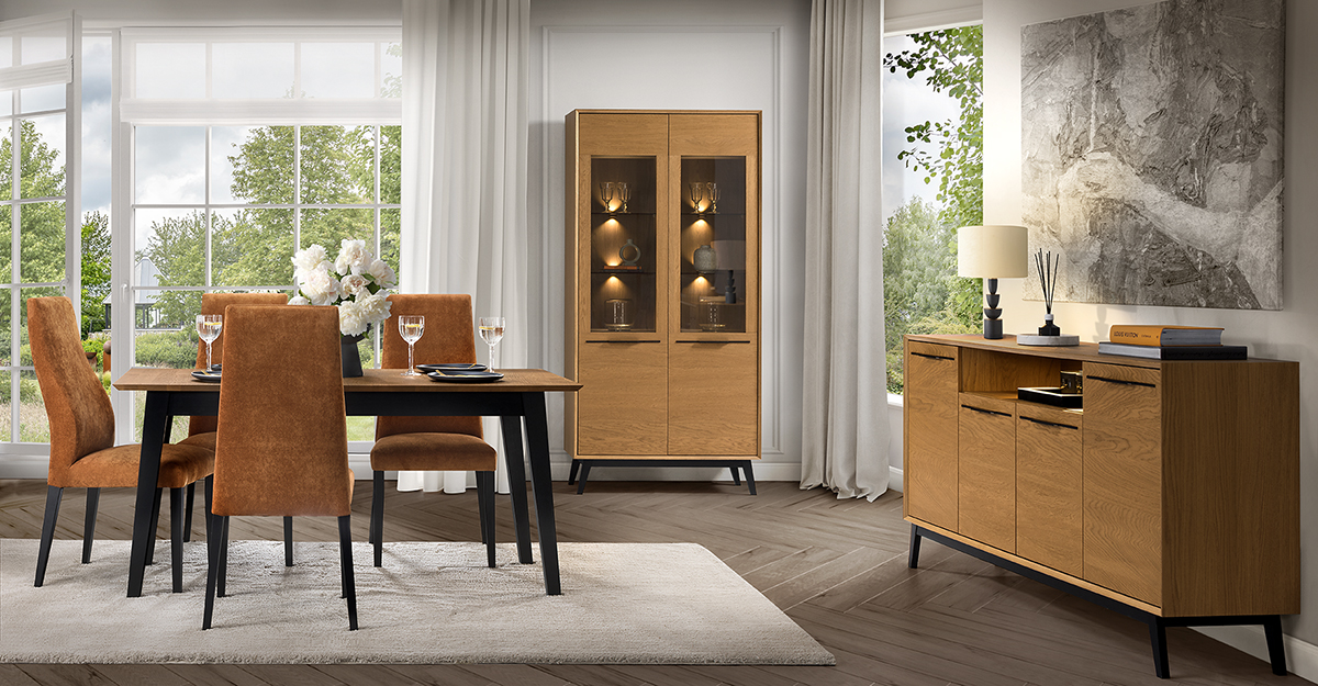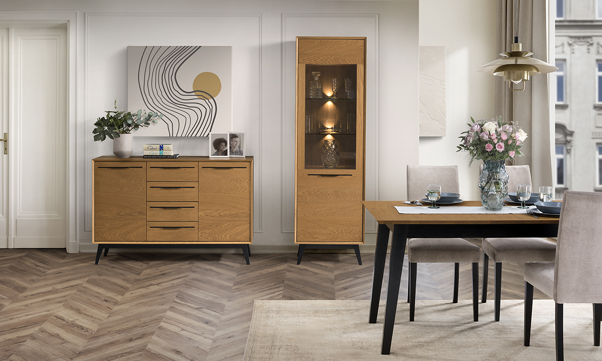 Luxusný elegantný sektorový nábytok ALZUR je vďaka svojmu precíznemu spracovaniu vhodný ako do moderného tak i do tradičného interiéru. Predná časť nábytku je vyrobená z masívneho dreva, zadná časť z dubovej dýhy, vnútorná časť je vyrobená z fóliovaného laminátu, povrch je upravený ekologickým olejom, čo zabezpečuje zdravotnú nezávadnosť nábytku. Sektor sa vyrába v farebnom prevedení dub karamelový. Použitie prírodných materiálov zaručuje kvalitu a odolnosť nábytku. Pánty a guličkové vedenie v šuflíkoch je vybavené systémom pomalého zatvárania. Sklo v hrúbke 4 a 8 mm je číre a tvrdené. Led osvetlenie je v cene. Sektor je doplnený kovovými úchytkami v čiernej farbe. Nohy sú z masíveneho dreva v čiernej farbe. Vďaka nábytku ALZUR si jednoducho a rýchlo zariadite obývaciu izbu či jedáleň. Pamätajte, že masívny a elegantný nábytok je investíciou na roky.