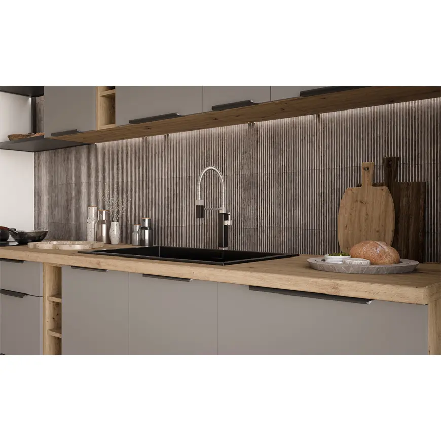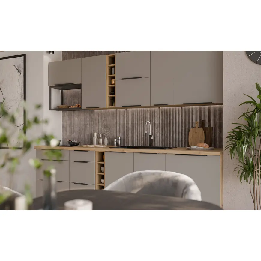 Sektorová kuchynská linka ARIA 255 v atraktívnom farebnom prevedení sandgrau / dub artisan je minimalistická a moderná, zároveň je však elegantná a nadčasová. Kombinácia dekoru svetlého dreva Dub artisan / sandgrau béžová pôsobí príjemne a útulne. Kuchynská linka je sektorová, je teda možné si vybrať z veľkého množstva skriniek a vyskladať kuchyňu podľa Vašich predstáv s požadovaným rozmerom. Pracovná doska nie je v cene v kuchynskej linky. Pracovnú dosku je možné doobjednať v dekore ladiacom ku korpusu kuchynskej linky Aria. Celkový moderný dizajn umocňujú úchytky v chrómovom dekore, ktoré sú v cene kuchynskej linky. Kuchynská linka je sektorová, je teda možné si vybrať z veľkého množstva skriniek a vyskladať kuchyňu podľa Vašich predstáv s požadovaným rozmerom.