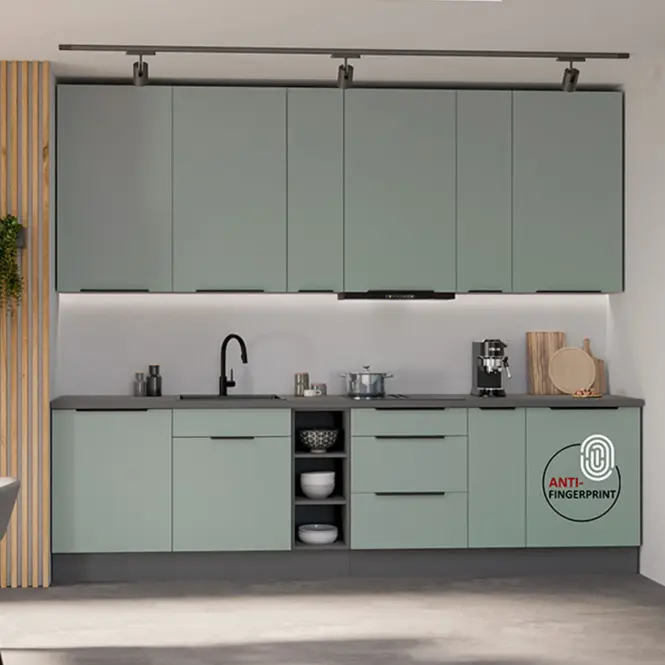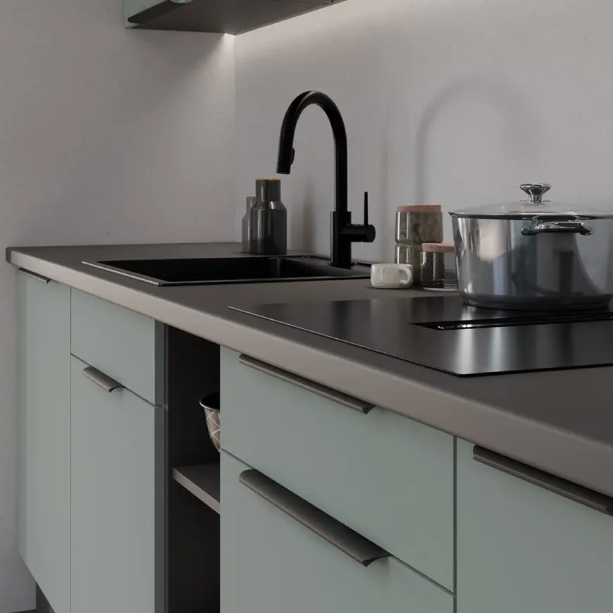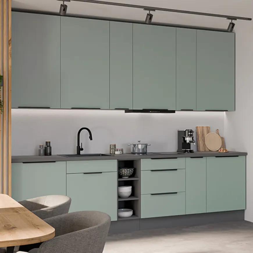 Sektorová kuchynská linka ARIA 300 v atraktívnom farebnom prevedení aquamarine / antracit je minimalistická a moderná, zároveň je však elegantná a nadčasová. Kombinácia dekoru antracit sivá / aquamarine zelená pôsobí príjemne a útulne. Kuchynská linka je sektorová, je teda možné si vybrať z veľkého množstva skriniek a vyskladať kuchyňu podľa Vašich predstáv s požadovaným rozmerom. Pracovná doska nie je v cene v kuchynskej linky. Pracovnú dosku je možné doobjednať v dekore ladiacom ku korpusu kuchynskej linky Aria. Celkový moderný dizajn umocňujú úchytky v chrómovom dekore, ktoré sú v cene kuchynskej linky. Kuchynská linka je sektorová, je teda možné si vybrať z veľkého množstva skriniek a vyskladať kuchyňu podľa Vašich predstáv s požadovaným rozmerom.