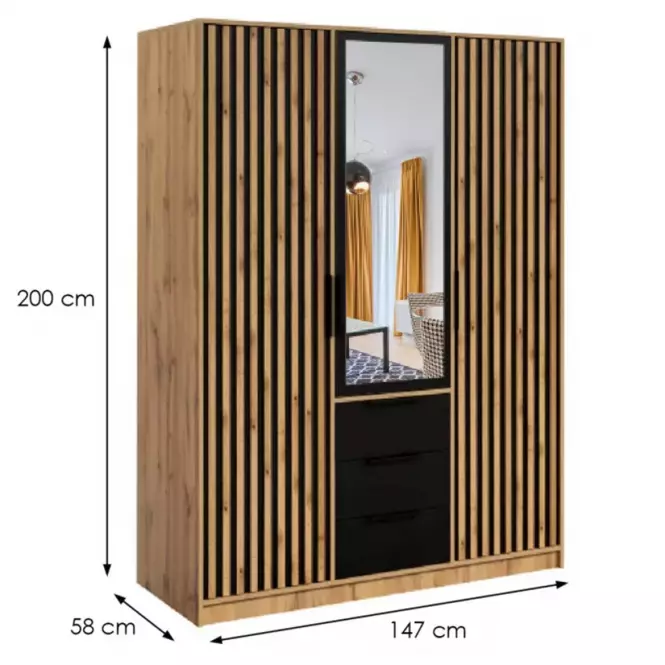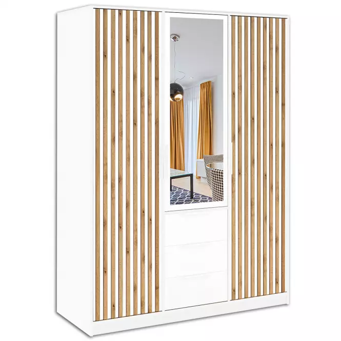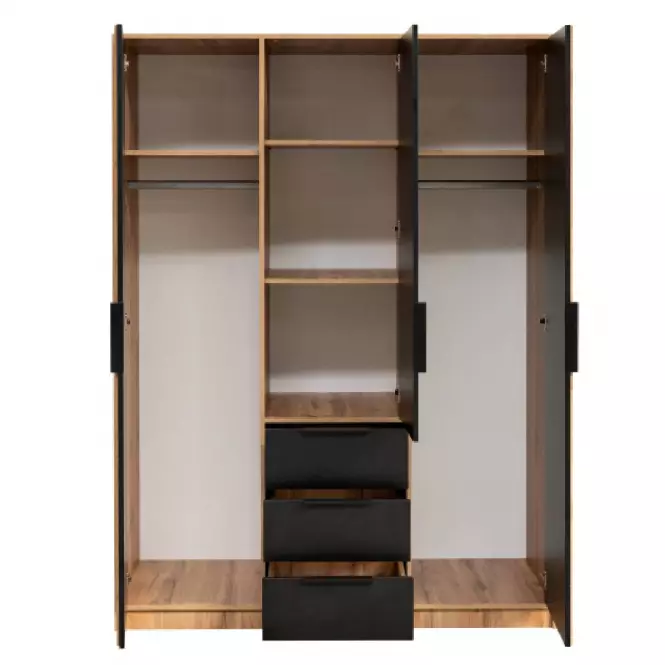 Táto moderná štvordverová skriňa vás očarí svojím nadčasovým dizajnom a harmonickým spojením neutrálnych farieb, ktoré pôsobia pokojne a prirodzene. Vďaka svojmu univerzálnemu vzhľadu sa hodí do predsiene, spálne, obývacej aj detskej izby a jednoducho zapadne do každého interiéru.