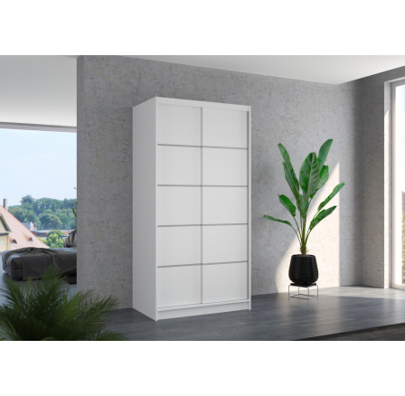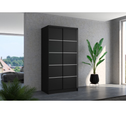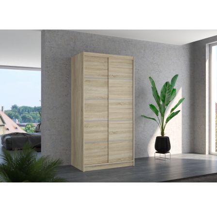 Moderná skriňa RIVA 100 s posuvnými dverami Vám ponúka úložný priestor v podobe políc a vešiakovej tyče. Celkový dizajn skrine dotvára zaujímavo riešený prvok z čierneho skla umiestnený na dverách skrine. V ponuke sú  farebné kombinácie ako : biela, sonoma, čierna , choco