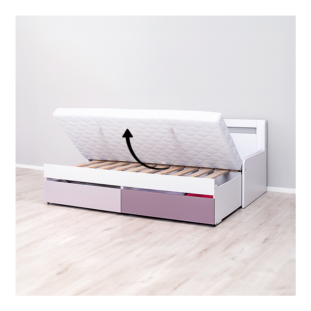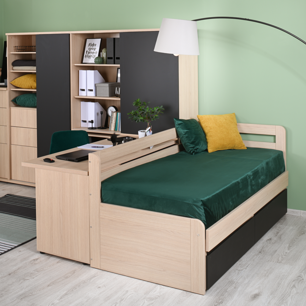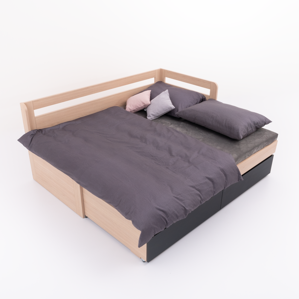 REA HOPPIP je kvalitná jednolôžková posteľ s možnosťou rozloženia. Rozkladá sa jednoducho vysunutím prídavného lôžka a otvorením matraca. Po rozložení poskytuje komfortnú plochu na spanie s rozmerom 179×200 cm. Obe lôžka sú v rovnakej výške, takže dokáže nahradiť aj manželskú posteľ. Pod prídavným lôžkom je praktický úložný priestor v podobe dvoch zásuviek s kvalitným guličkovým plnovýsuvom, vďaka čomu je otvárenie zásuvky plynulé a tiché. Je vhodná do detských či študentských izieb. Dieťa je vďaka čelám chránené od chladu zo steny a zároveň je stena chránená pred poškodením.