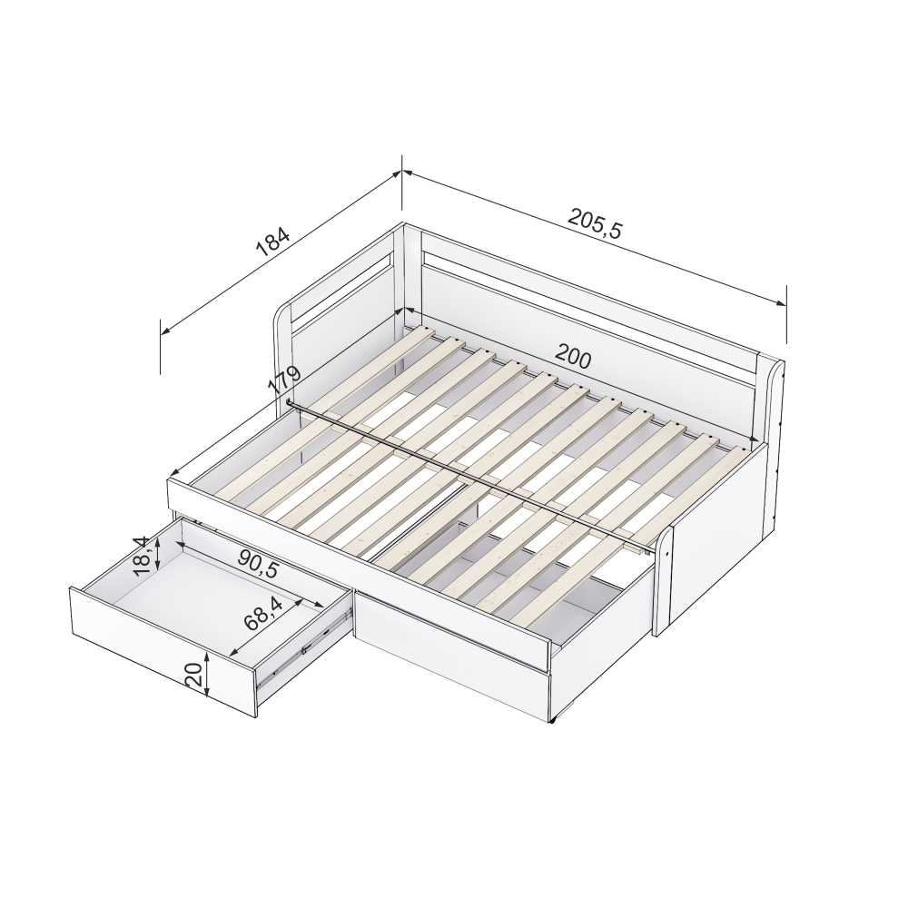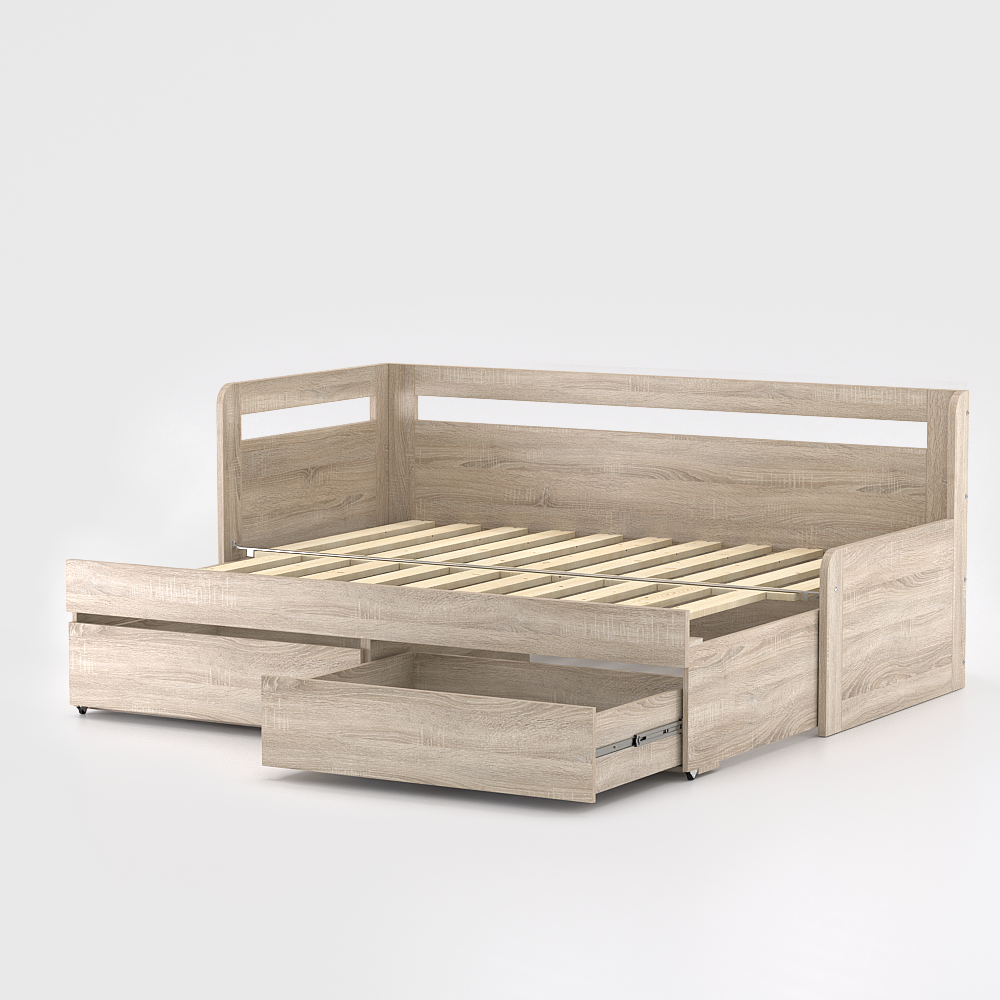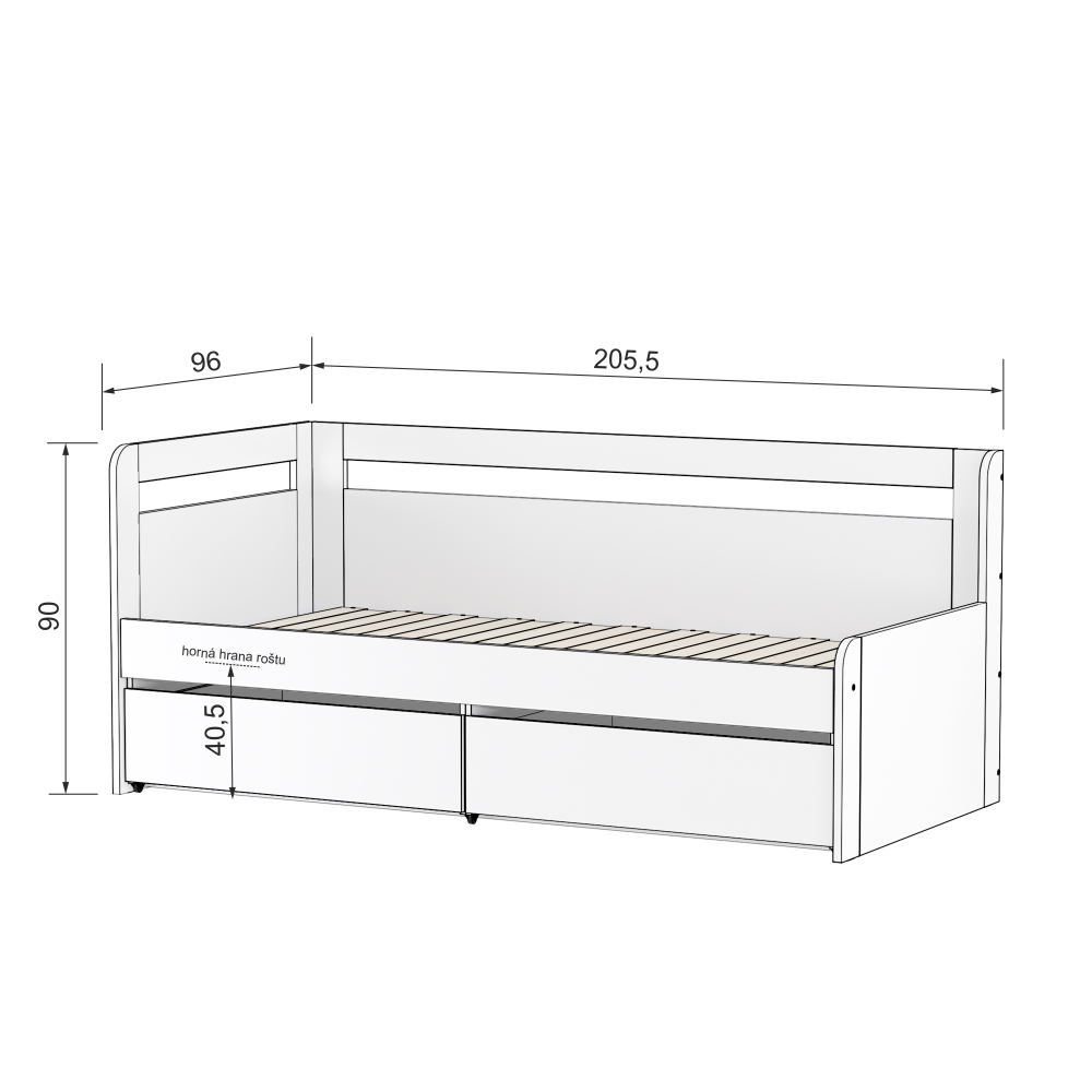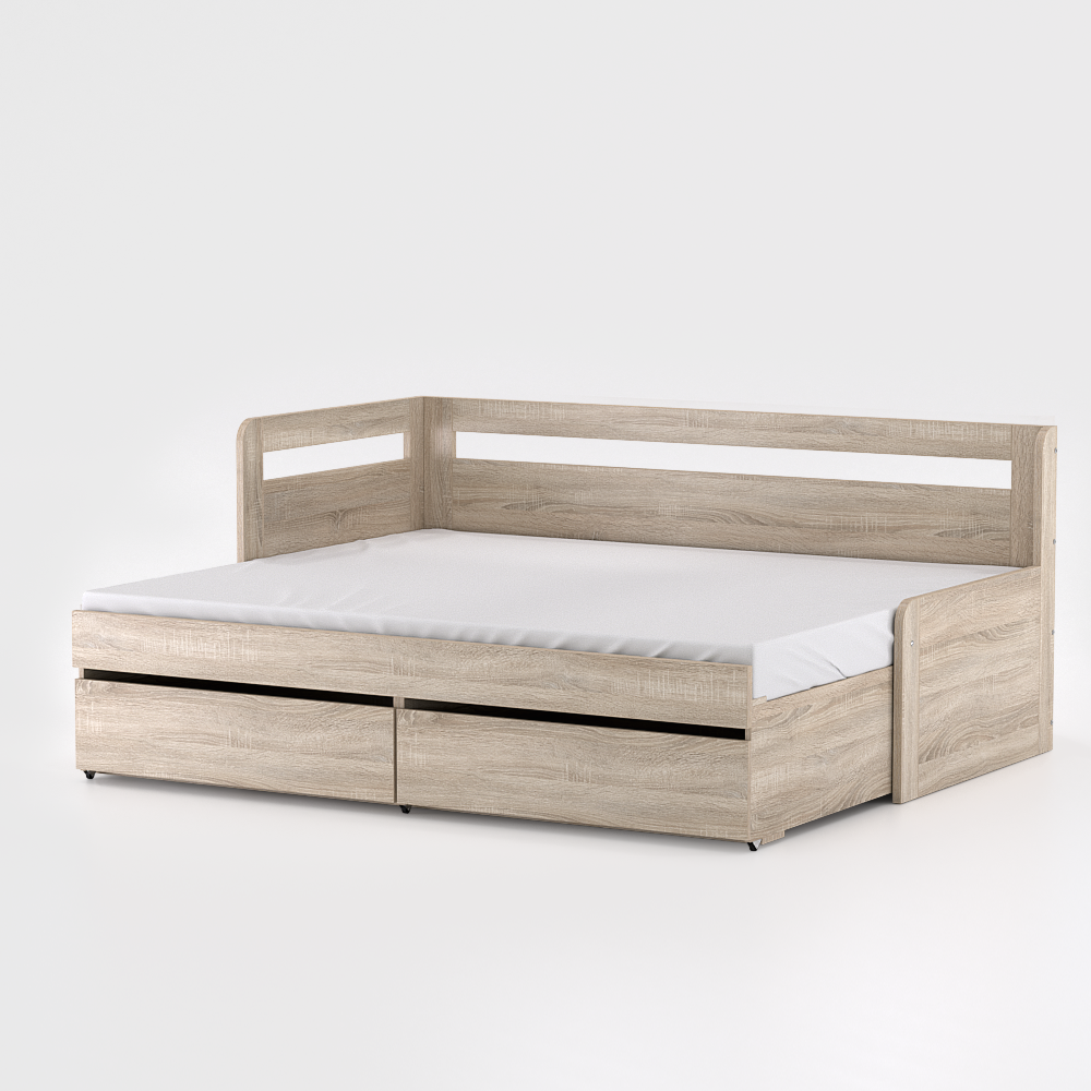 REA HOPPIP je kvalitná jednolôžková posteľ s možnosťou rozloženia. Rozkladá sa jednoducho vysunutím prídavného lôžka a otvorením matraca. Po rozložení poskytuje komfortnú plochu na spanie s rozmerom 179×200 cm. Obe lôžka sú v rovnakej výške, takže dokáže nahradiť aj manželskú posteľ. Pod prídavným lôžkom je praktický úložný priestor v podobe dvoch zásuviek s kvalitným guličkovým plnovýsuvom, vďaka čomu je otvárenie zásuvky plynulé a tiché. Je vhodná do detských či študentských izieb. Dieťa je vďaka čelám chránené od chladu zo steny a zároveň je stena chránená pred poškodením.