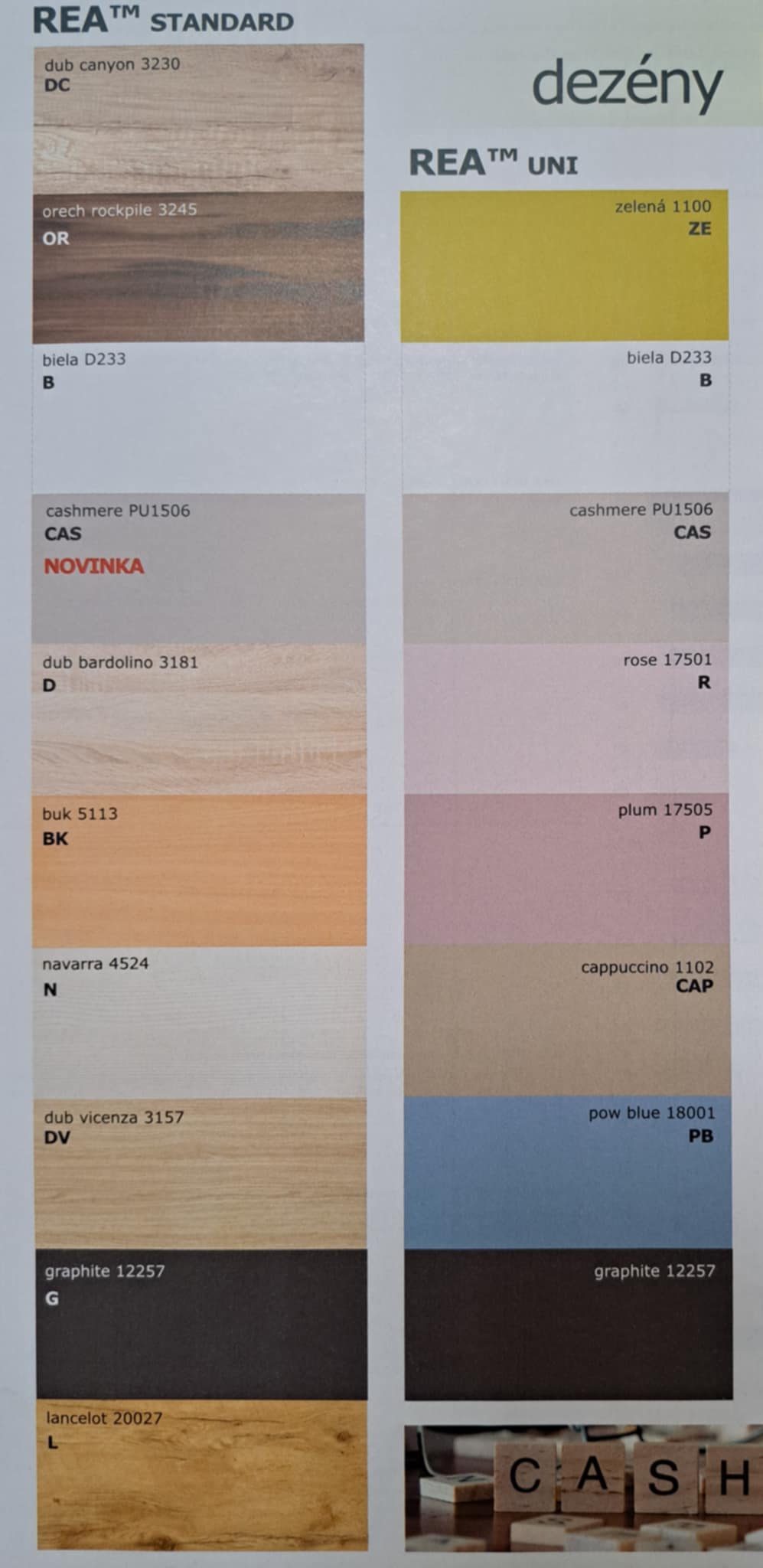 Dostupné farebné prevedenia čiel zásuviek vo výplňových dezénoch REA Štandard alebo UNI color – potrebné uviesť pri objednávke v poznámke.