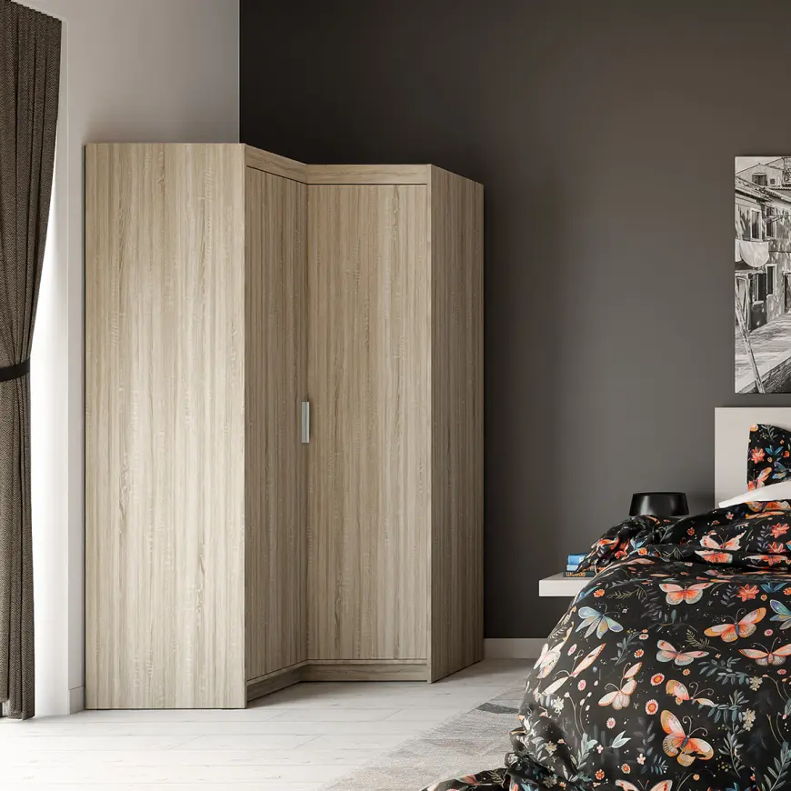 Skriňa ELENA 2D rohová  je univerzálnym nábytkom a svojim štýlom zapadne do modernej obývacej izby aj do spálne či predsiene. Skriňa ELENA je vyrobená z vysoko kvalitných materiálov, odolných proti poškriabaniu a slnečnému žiareniu, zaisťujúcich vysokú životnosť a bezpečnosť používania. Interiér skrine bol navrhnutý tak, aby oddelil priestor s policami a miestom s vešiakom na šaty.  Model sa vyznačuje jednoduchými tvarmi a priestranným interiérom. Jemné úchytky zdobia model pri zachovaní jeho reprezentatívnej hodnoty.