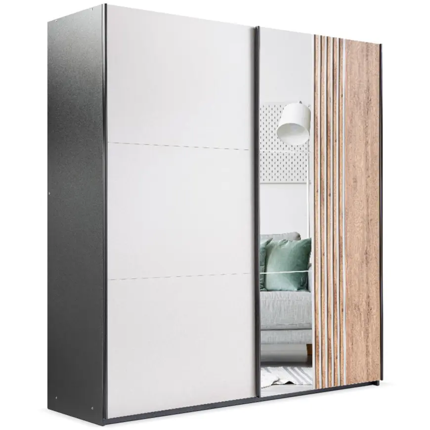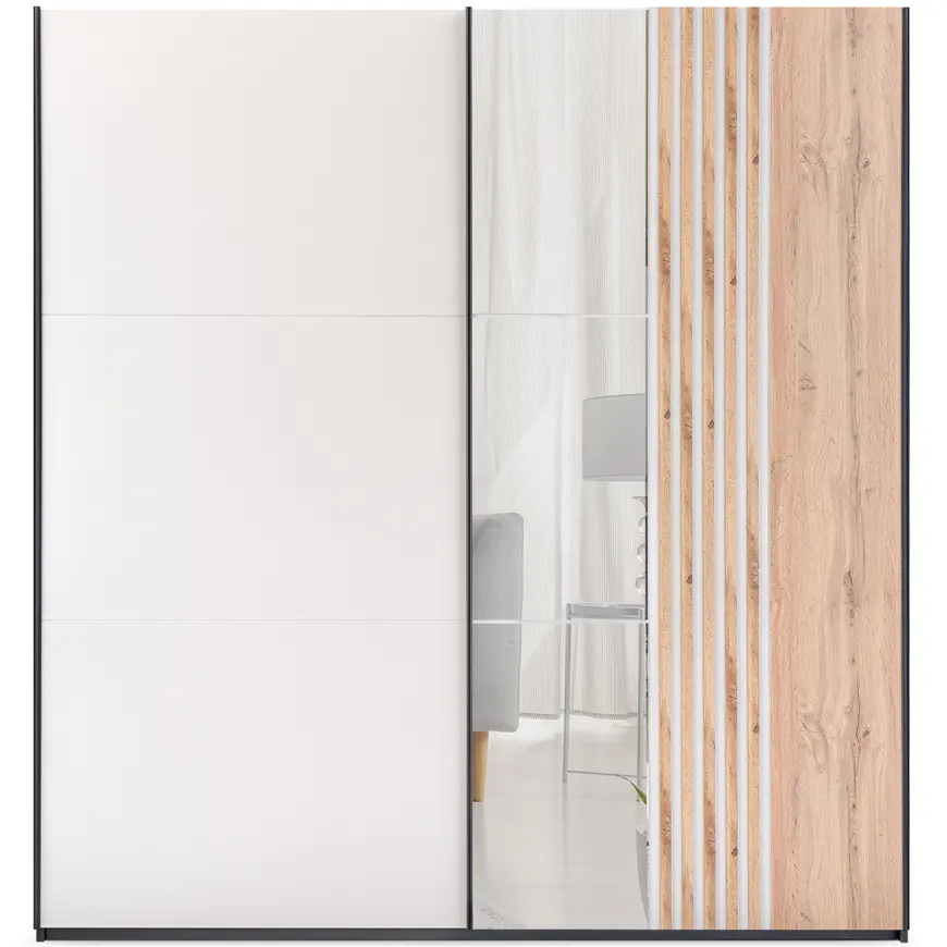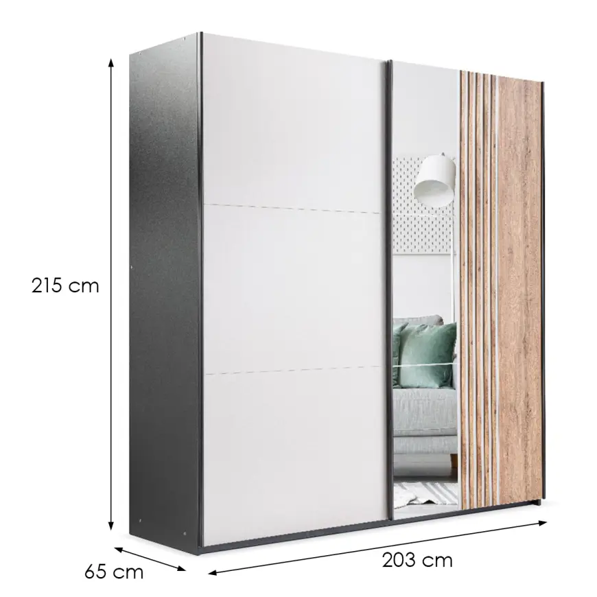 Táto moderná skriňa spája dynamický vzhľad s precíznym spracovaním a prináša všetko, čo potrebujete pre pohodlné a bezpečné každodenné používanie. Farebná kombinácia – čierna, kašmír a dub wotan je tým pravým riešením pre váš moderný dizajn vo vašej splálni.
