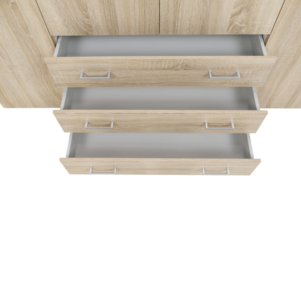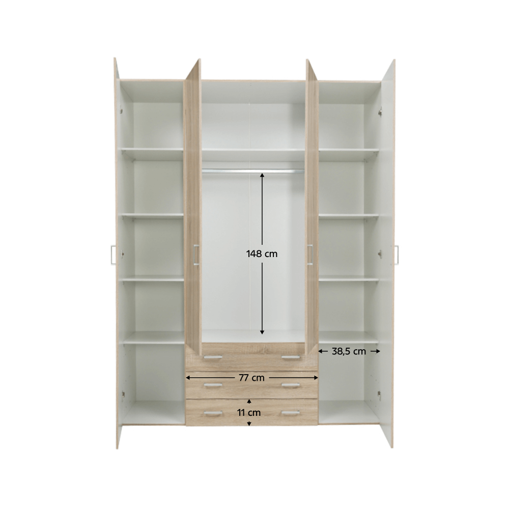 Šatníková skriňa GWEN je vo farebnom prevedení biela s extra vysokým leskom alebo dub sonoma. Skriňa je vyrobená z DTD fóliovanej. Za otváracími dvierkami nájdete dostatok úložného priestoru v podobe 3 šuplíkov, vešiakovej časti a časti s policami.