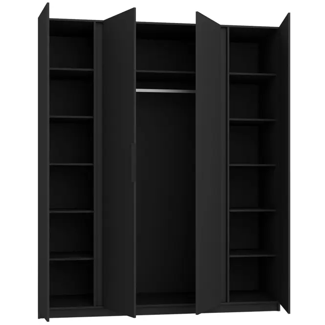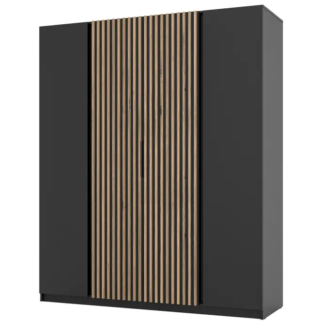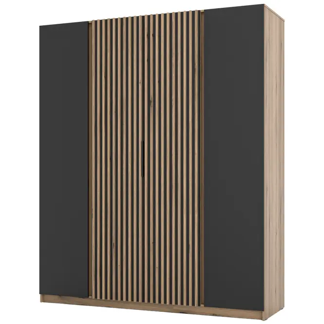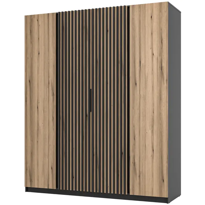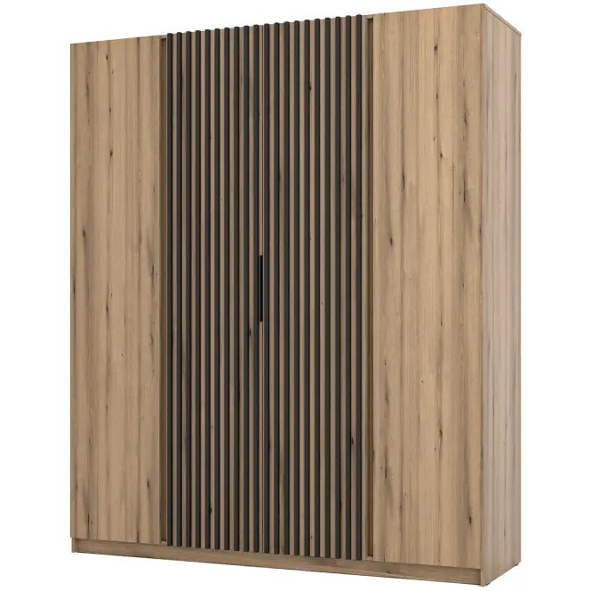 Skrine KAJA sú viac než len úložný nábytok – sú výsledkom starostlivého dizajnu s praktickým prístupom k organizácii priestoru. Ich pôsobivá kapacita umožňuje usporiadať aj najrozsiahlejší šatník alebo zbierku predmetov pri zachovaní estetiky a vysokej kvality spracovania. Široká škála farebných kombinácií navyše umožňuje prispôsobiť skrine Kaja akémukoľvek dizajnu interiéru a dodať im pôsobivý štylistický akcent. Šatník má 4 dvierka bez zrkadla a vnútorné dvere majú skrutkovacie lamely. Za strednými dverami je jedna polica a vešiak na šaty