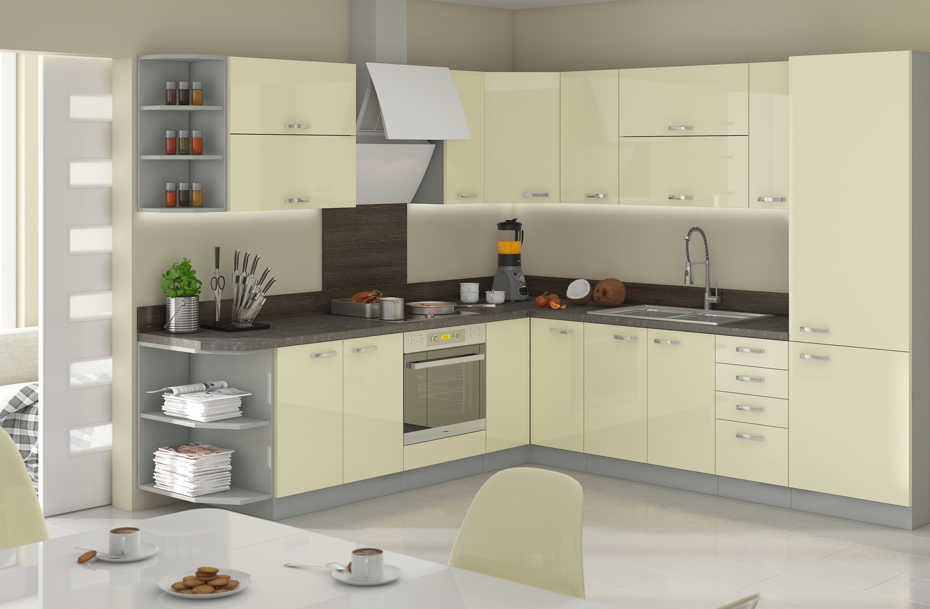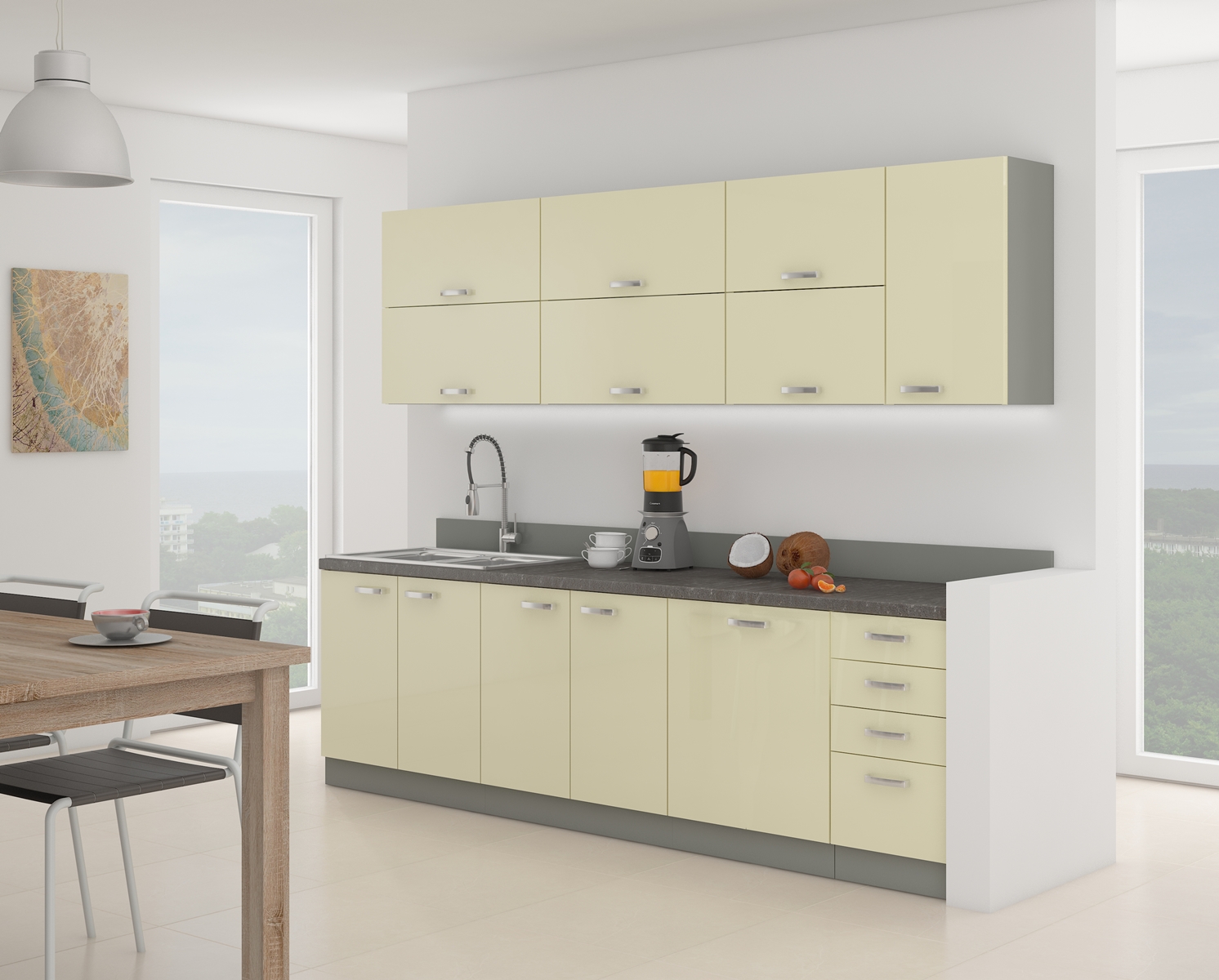 Luxusná kuchynská zostava KARMEN dodá každej kuchyni žiarivý lesk. Jej dizajn sa hodí do rôzne farebných a materiálových miestností, kde dostatočne vynikne a nebude pôsobiť rušivo. V skrinkách je dostatočný úložný priestor, ktorý zabezpečí, aby ste mali všetko vždy poruke, na správnom mieste, pripravené na použitie, čo je v každej kuchyni to najdôležitejšie. Skrinky si môžete poskladať v ľubovoľnom poradí podľa vašich predstáv. Šírka hornej a spodnej zostavy je 2,6 m. Dolné skrinky základnej zostavy sú dodávané bez pracovnej dosky, ktorú je možné objednať. Má systém tichého zatvárania a kovové úchytky vo farbe leštený chróm. Kuchynská linka je sektorová, je teda možné si vybrať z veľkého množstva skriniek a vyskladať kuchyňu podľa Vašich predstáv s požadovaným rozmerom. Uvarte si ráno kávu pri takejto linke, hneď získate pocit, že vás čaká skvelý deň.