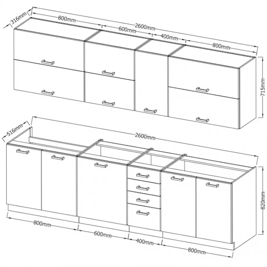 | Šírky spodných skriniek v zostave: | 80 + 60 + 40 + 80 cm |