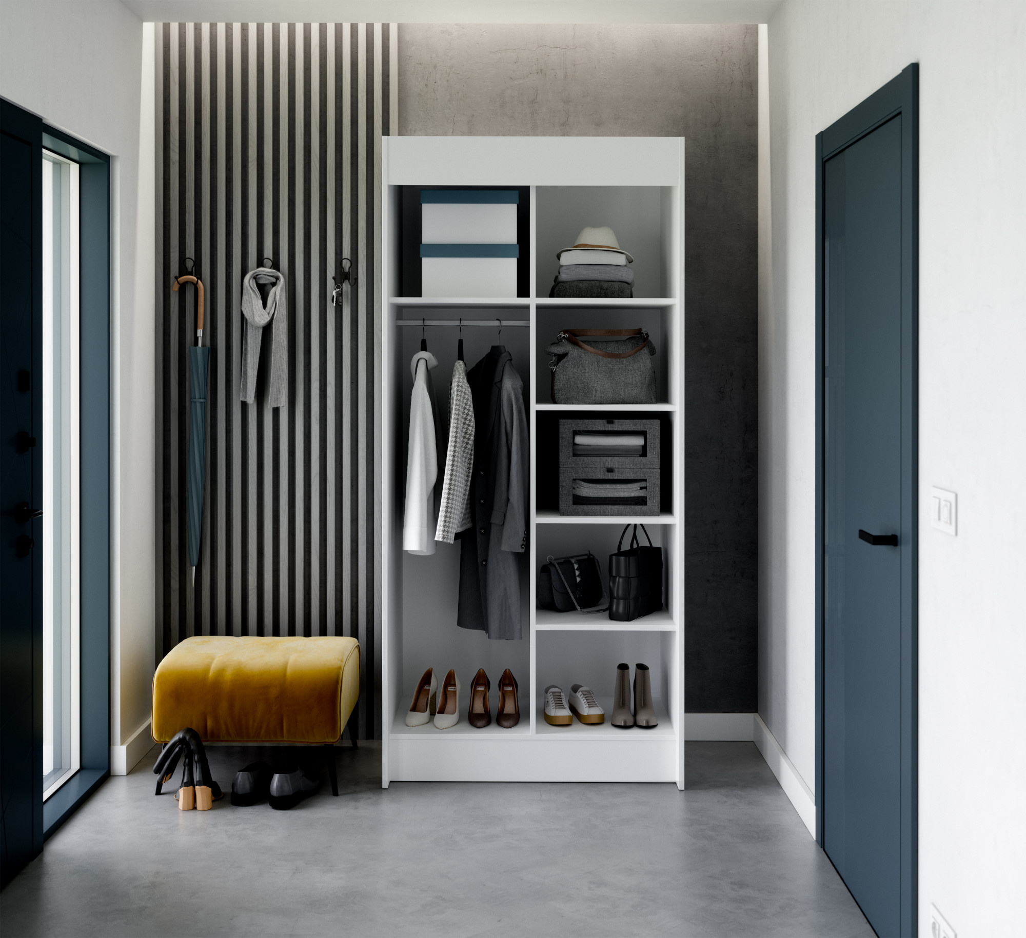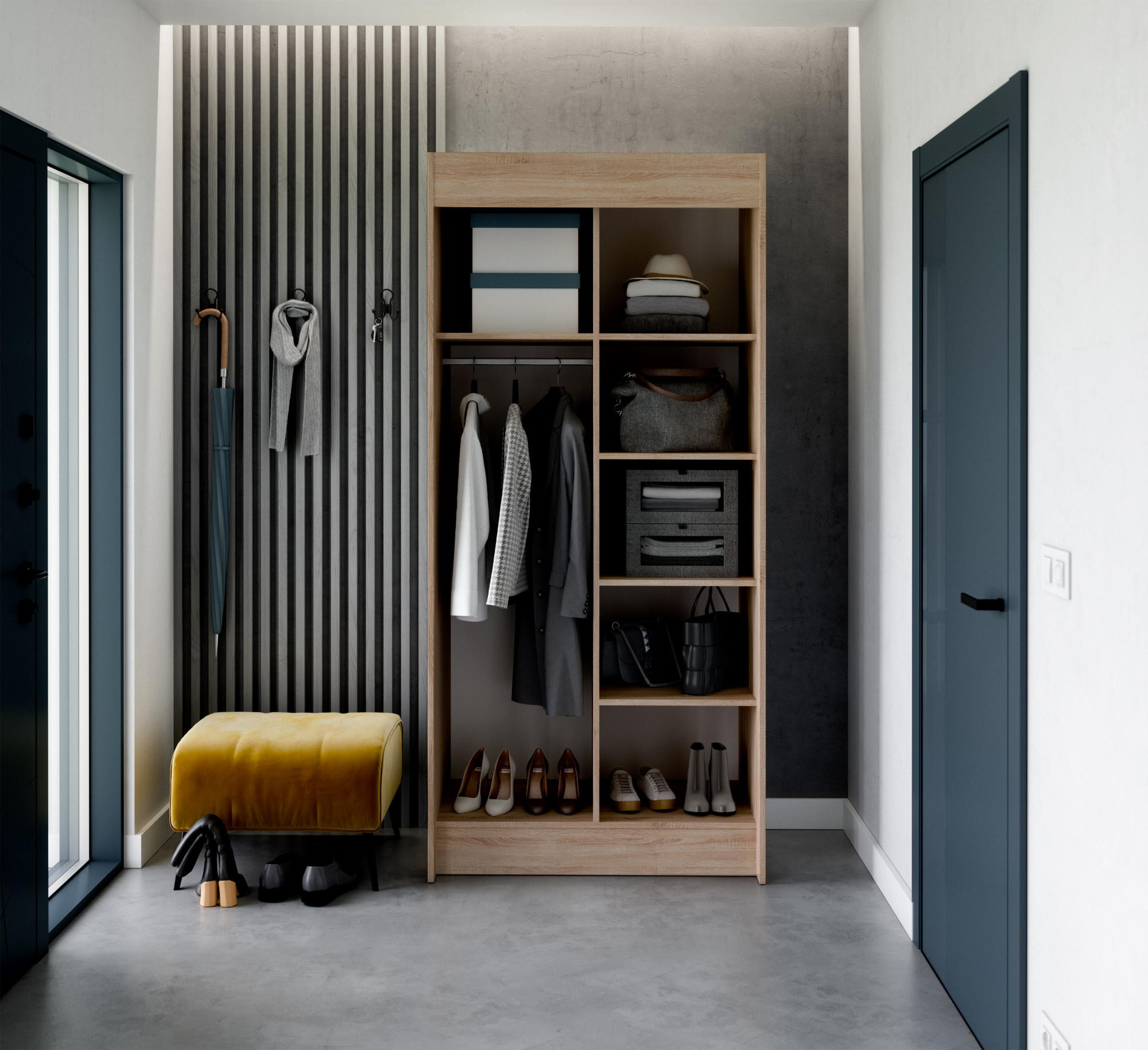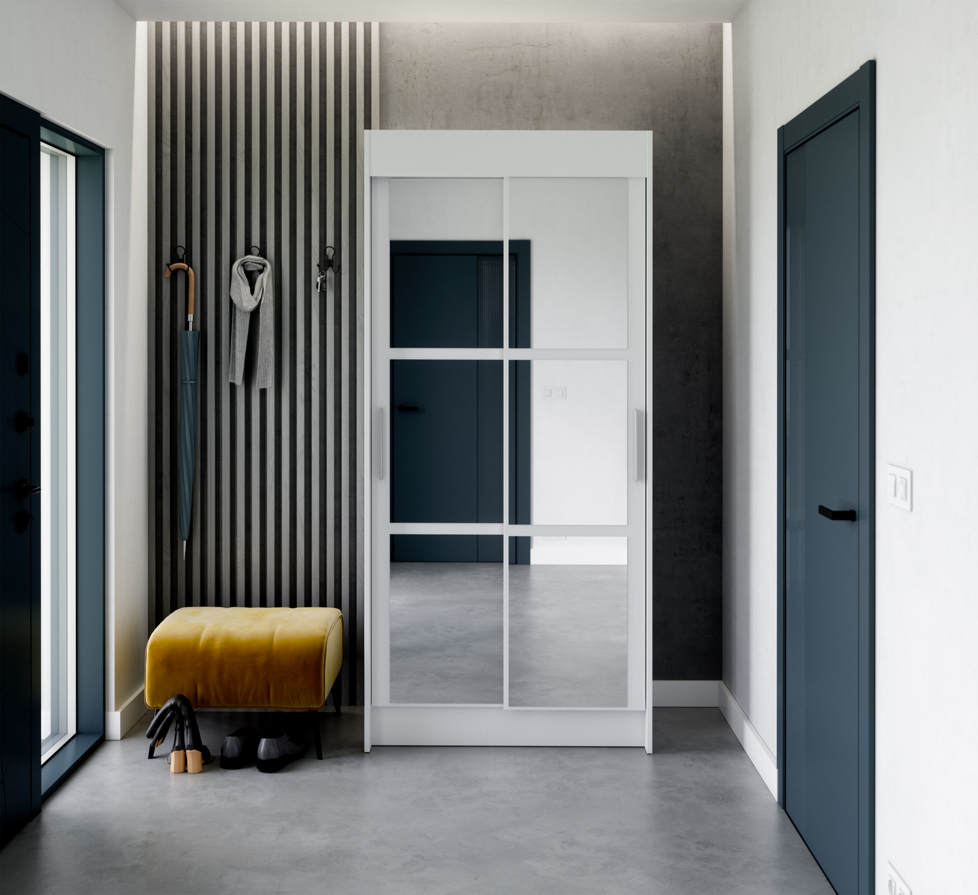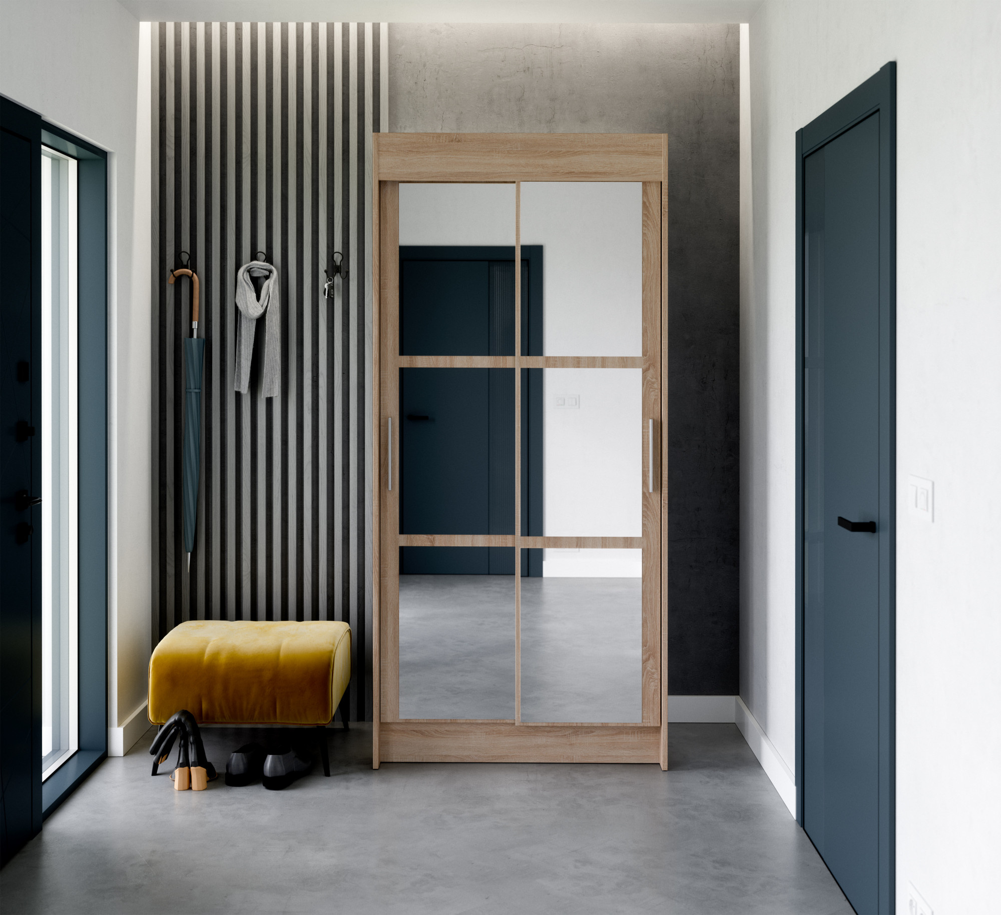 Skriňa s posuvnými dverami KARYL je ideálnym riešením ako si usporiadať priestor. Skriňa je vybavená priestrannými policami a tyčou, na ktorú si môžete zavesiť šaty, obleky, vrchné oblečenie alebo košele. Vďaka tomu, že skriňa je posuvná, nemusíte vyčleňovať ďalší priestor na otváranie dverí, čo z nej robí perfektné riešenie pre malú miestnosť alebo úzku chodbu. Bonusom je zrkadlo, elegantne umiestnené na obidvoch dvierkach skrine.