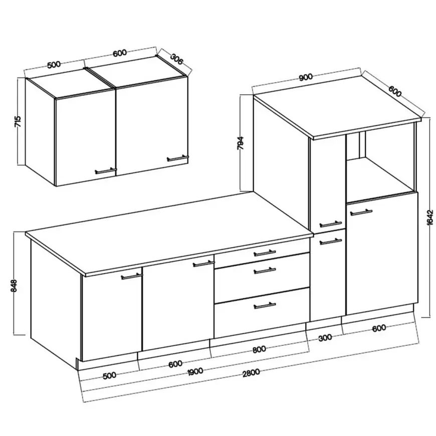 | Šírky spodných skriniek v zostave: | 50 + 60 + 80 + 30 + 60 cm |