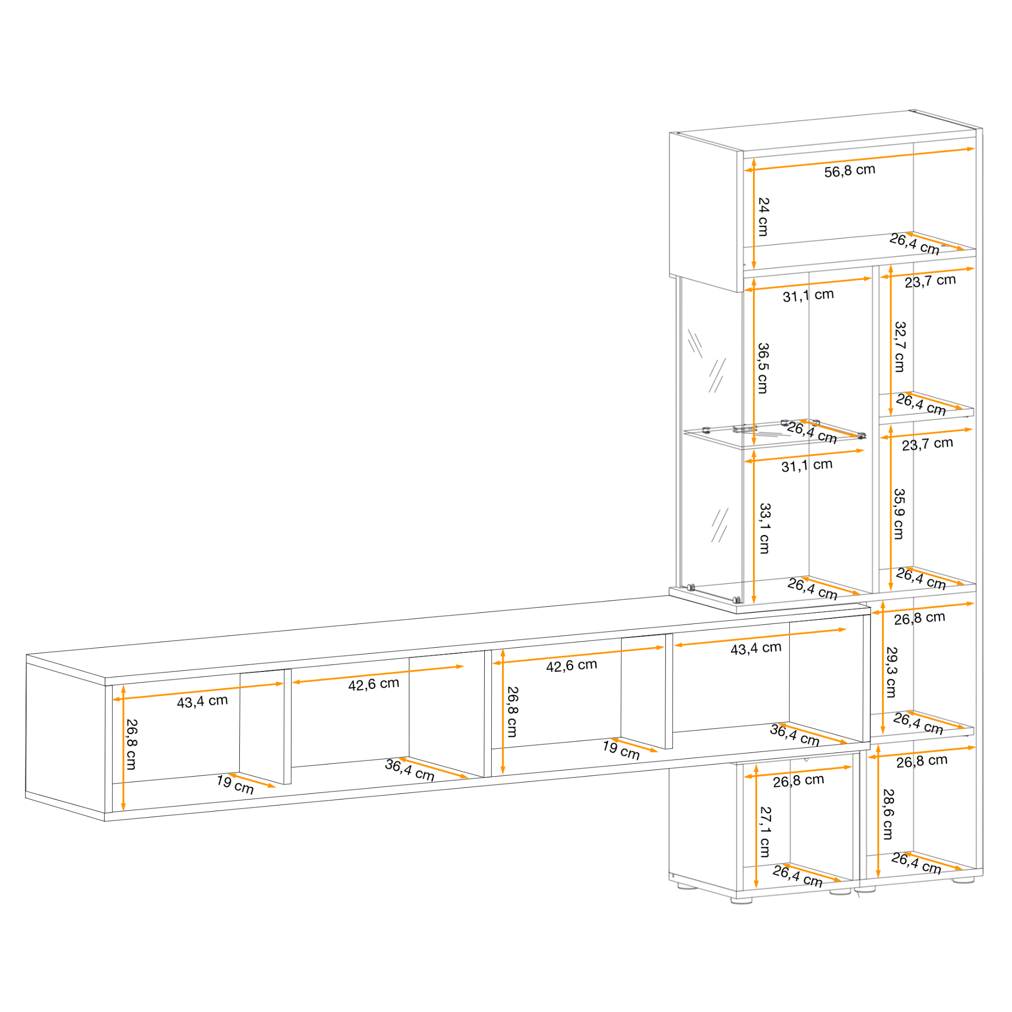 Obývacia stena NERINO je zostava určená ľuďom, ktorí hľadajú a oceňujú minimalizmus v kombinácii s atraktívnymi farbami. Táto nástenná skrinka malých rozmerov bude vyzerať skvele v moderných interiéroch alebo v elegantných glamour aranžmánoch. Obývacia stena sa skladá z televíznej skrinky a vitríny, ktoré tvoria jeden kompaktný celok. RTV skrinka je vybavená dvojicou výklopných dvierok, za ktorými sa nachádza priestor rozdelený na dve časti, čo umožňuje uložiť rôzne predmety alebo príslušenstvo k televízoru. Vitrína je čiastočne presklená, čo umožňuje vystaviť dekorácie alebo fotografie. Výhodou je osvetlená polica, ktorá večer vytvorí v obývačke výnimočnú atmosféru. LED osvetlenie je v cene. Druhá časť vitríny je vybavená štandardnými policami, na ktoré možno umiestniť rôzne predmety. Moderná obývacia zostava NERINO je vybavená systémom otvárania skrinky “push to open” bez úchytiek. Na otvorenie skrinky stačí stlačiť jej prednú časť.