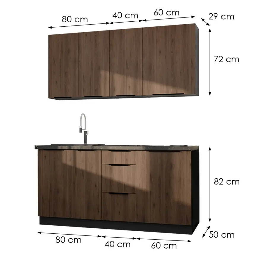 | Šírky horných skriniek v zostave: | 80 + 40 + 60 cm |