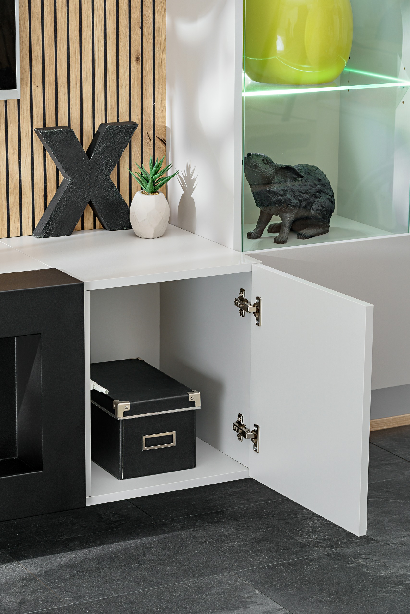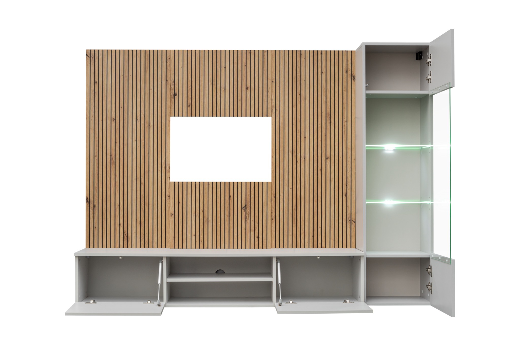 Moderná obývacia stena NERI Lsa určite stane neprehliadnuteľným kúskom Vašej obývačky. Súčasťou obývacej steny je panel, ktorý je tvorený v dnešnej dobe obľúbenými lamelami. Súčasťou steny je dlhá 2-dverová RTV skrinka. Závesná dvierková skrinka obsahuje police, ktoré ju rozdeľujú na priestory. Korpus v prevedení perla grey s LED podsvietením pôsobí elegantne a zároveň moderne. Vstavané LED osvetlenie vytvára atmosférickú atmosféru a zvýrazňuje exponované prvky. Ide o kus nábytku, ktorý vnáša do interiéru harmóniu a štýl a zároveň ponúka komfort pre každodenné používanie.