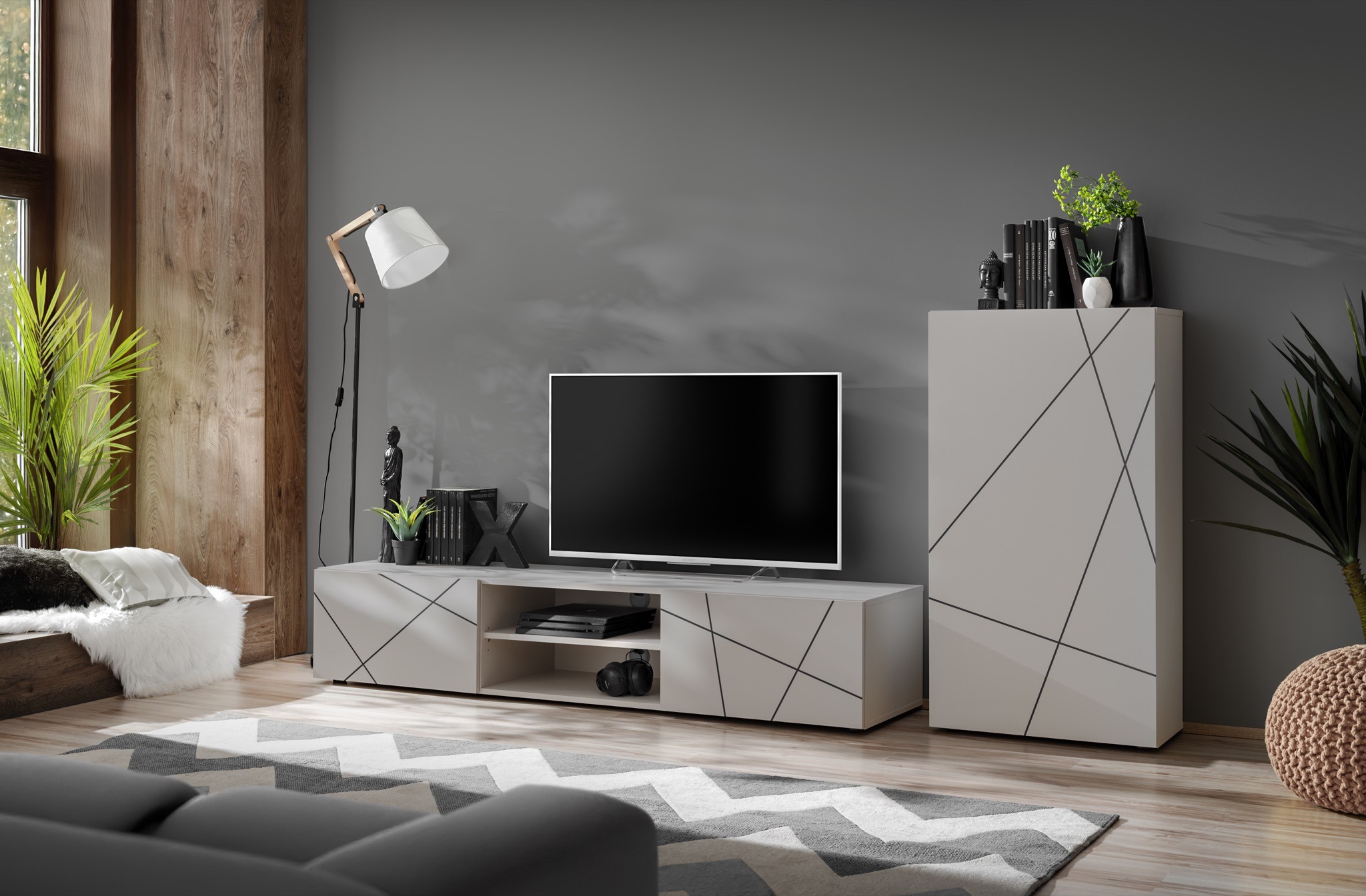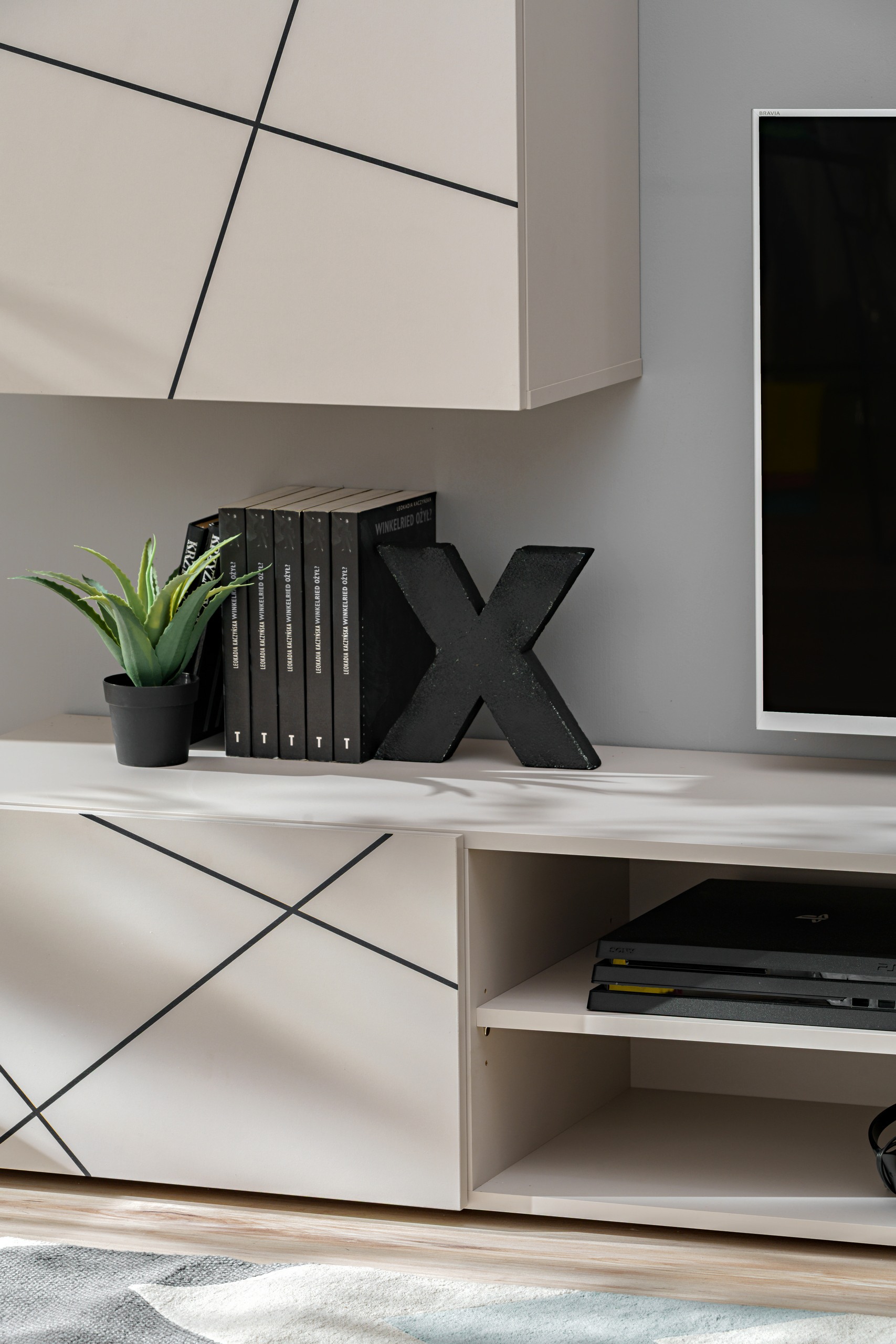 Obývacia stena NERO I vyhotovená v modernej kombinácii kašmíru a čiernych pásov vytvorí z vašej obývacej izby štýlovo zariadený priestor na relaxáciu aj stretávanie s rodinou či priateľmi. Základným prvkom zostavy je priestranný TV stolík vybavený uzatvárateľnými 2 výklopnými dverami a tiež otvorenými odkladacími priestormi, ktoré sú ideálne na uloženie multimediálnych zariadení. Na stolík plynule nadväzuje nástenná vitrína v atraktívnom vyhotovení. Počas montáže si navyše môžete sami zvoliť či vitrínu umiestnite na stenu alebo ju jednoducho položíte na zem. Jednotlivé prvky sú vyrobené z kvalitnej laminovanej DTD s povrchom nenáročným na údržbu. Ide o kus nábytku, ktorý vnáša do interiéru harmóniu a štýl a zároveň ponúka komfort pre každodenné používanie.