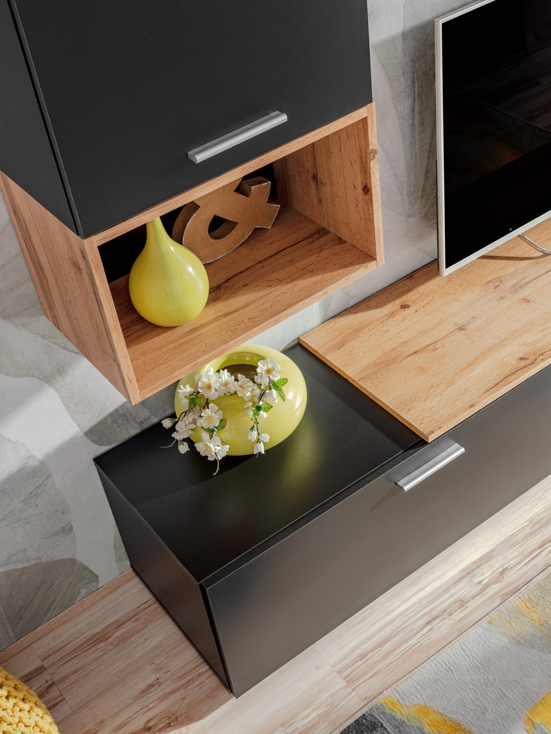 Obývacia stena NERZE II je moderná zostava nábytku, ktorá sa vyznačuje vynikajúcou funkčnosťou a originálnym dizajnom. Použitá moderná farebná kombinácia zdôrazňuje štýlový a estetický charakter nábytku. Obývacia zostava bola navrhnutá tak, aby poskytovala čo najviac úložného priestoru. Obývacia stena NERZE II pozostáva zo závesnej skrinky, TV stolíka a otvorenej police, kde si môžete uložiť dekorácie alebo fotografie.