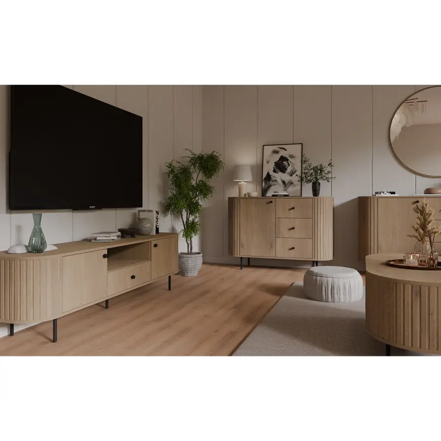 OVALIO bol navrhnutý tak, aby každý prvok – vitrína, komoda, stôl alebo TV stolík – mohol fungovať samostatne a zároveň s ostatným nábytkom vytvárať ucelený a harmonický celok.