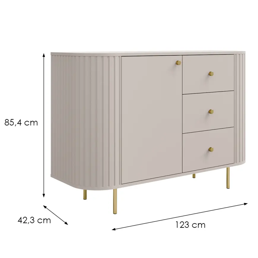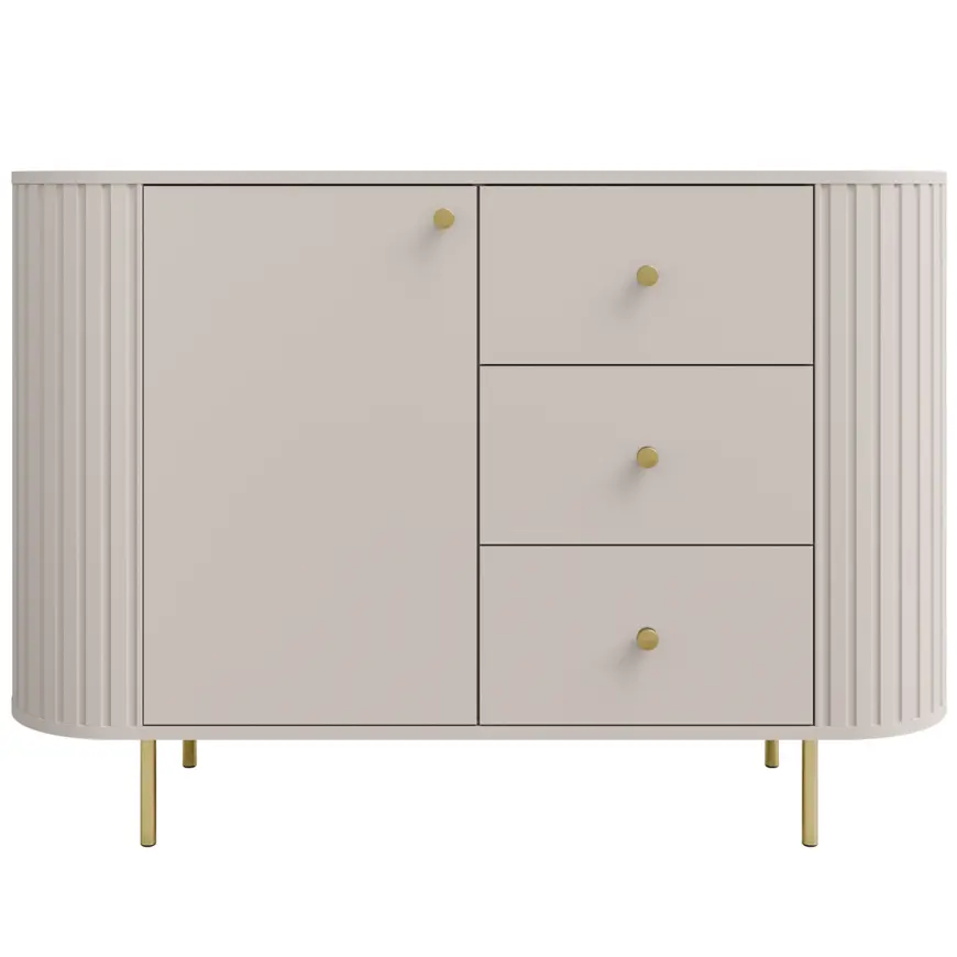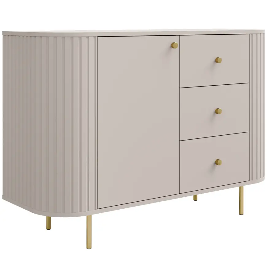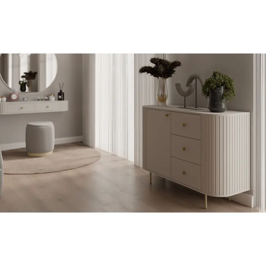 Tlmené farby pieskovo béžovej a cremónskeho duba robia z nábytku perfektný doplnok do svetlých, moderných interiérov. Zlaté detaily alebo čierne, závisí od vybraného variantu, krásne rozbíjajú hladký povrch a dodávajú kolekcii nádych noblesy.
