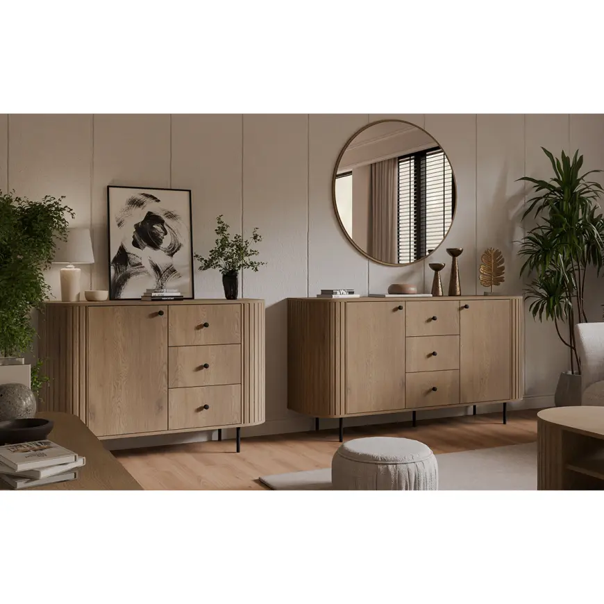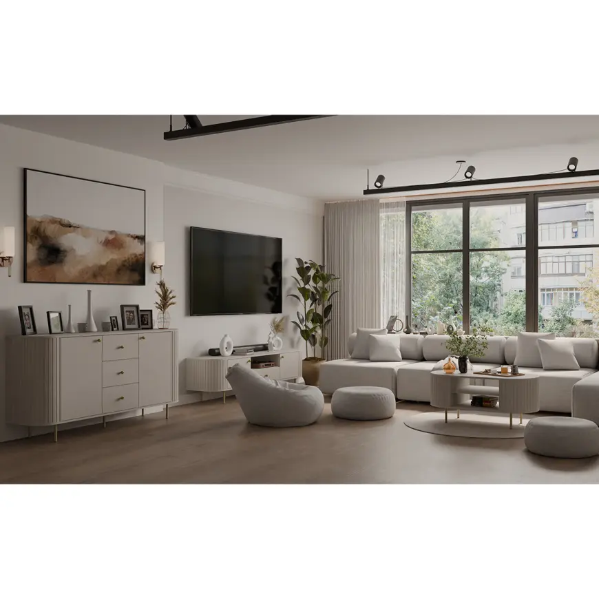 OVALIO bol navrhnutý tak, aby každý prvok – vitrína, komoda, stôl alebo TV stolík – mohol fungovať samostatne a zároveň s ostatným nábytkom vytvárať ucelený a harmonický celok.
