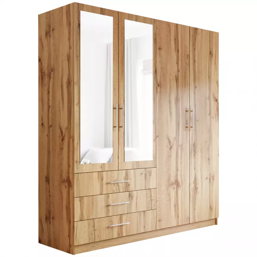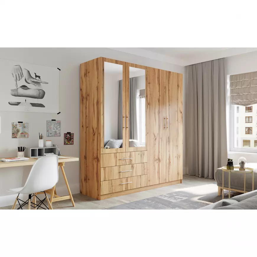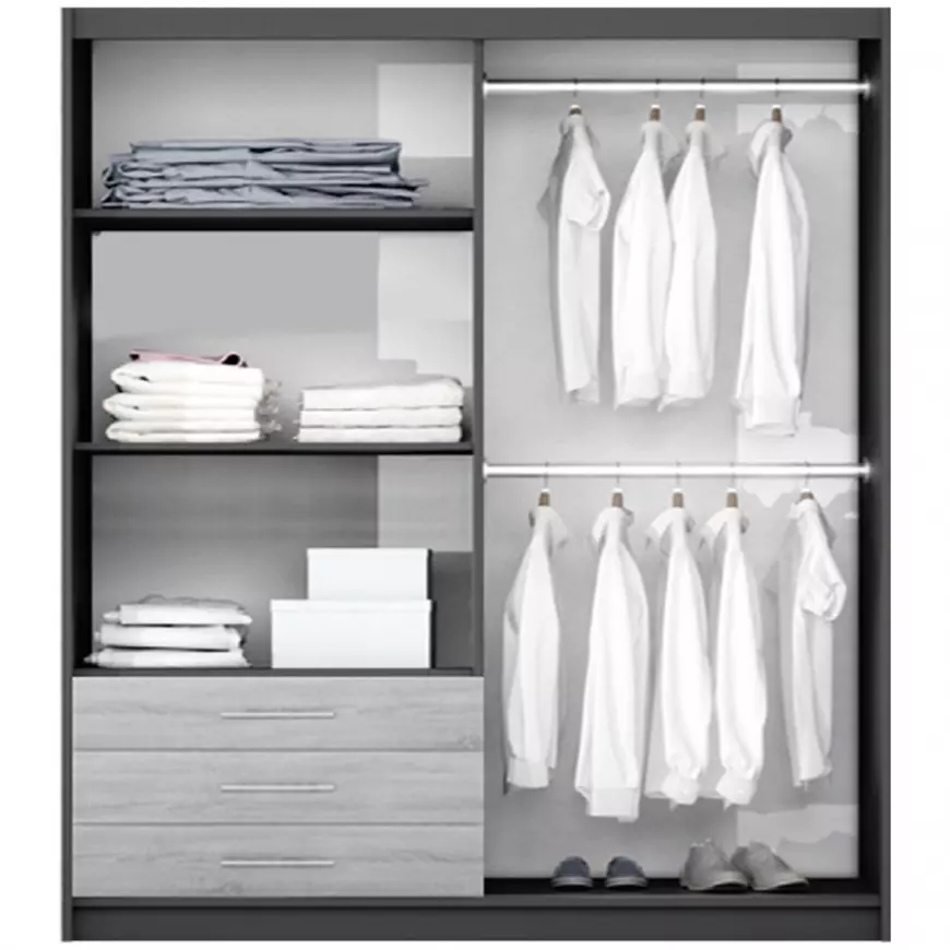 Skriňa je vyrobená z kvalitných a odolných materiálov, čo zaručuje jej pevnosť, stabilitu a dlhú životnosť. Prakticky riešený vnútorný priestor ponúka dostatok miesta na oblečenie aj doplnky, takže budete mať všetko prehľadne usporiadané.
