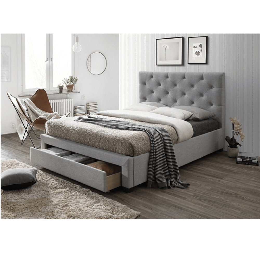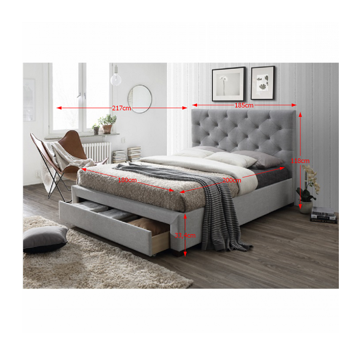 Luxusná posteľ SANTOLA nesie všetky prvky moderného dizajnu. Sivá látka je príjemná na dotyk. Posteľ stojí na stabilných nohách v prevedení wenge. Vysoké prešívané čelo je čalúnené sivou látkou. Oprite sa a začítajte sa do obľúbenej knihy. Súčasťou postele je praktický úložný priestor vo forme veľkej zásuvky. Už si nebudete musieť lámať hlavu nad tým, kde uložíte nepotrebné veci. Posteľ sa dodáva s rolovaným roštom.