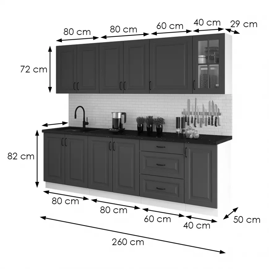 | Šírky spodných skriniek v zostave: | 80 + 80 + 60 +40 cm |
