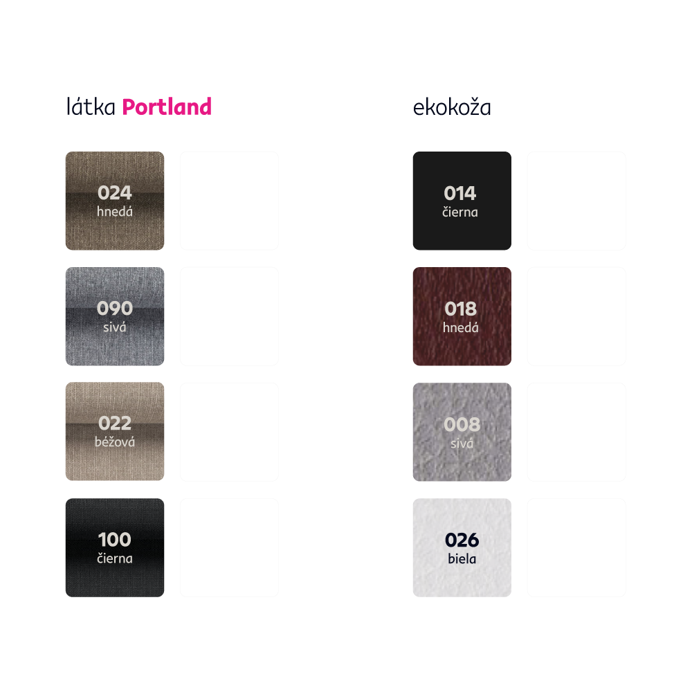 Možnosť objednania v 4 farebných odtieňoch ekokože a v 6 farebných odtieňoch látky Portland v cene 1.559 EUR. Doba dodania 6-8 týždňov