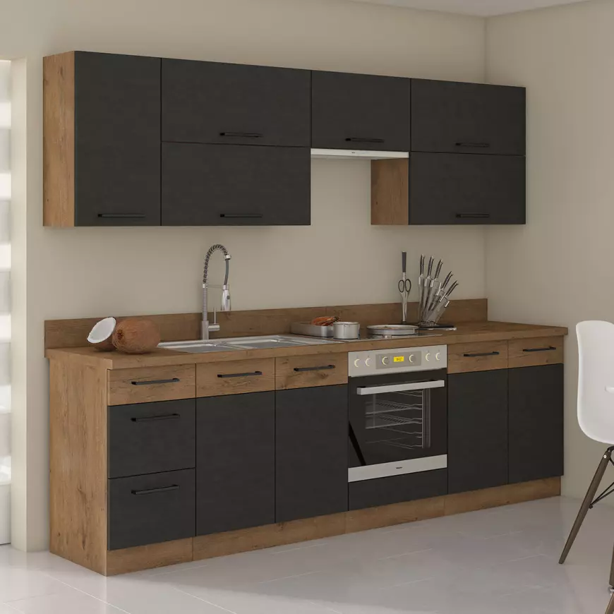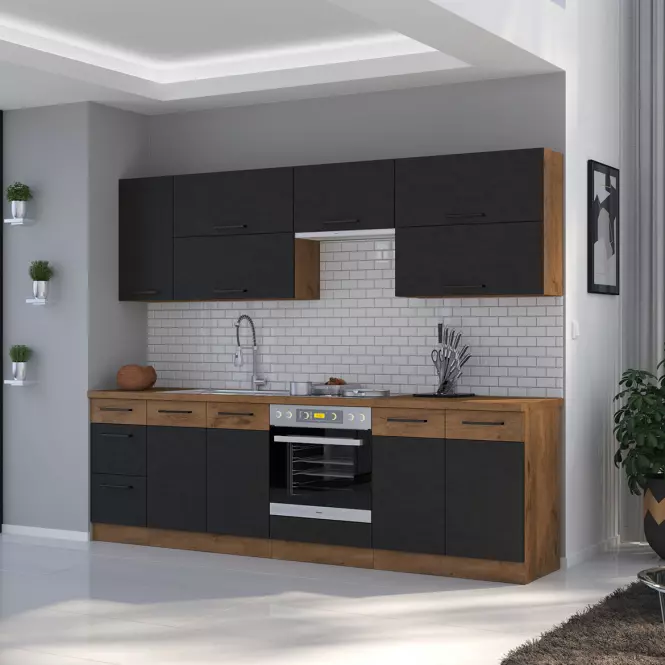 Sektorová kuchynská linka VIGO 260 je minimalistická a moderná, zároveň je však elegantná a nadčasová.Moderný vzhľad zaručuje farebná kombinácia sivá matná a dub lancelot. Vyrobená je z DTD laminovanej. Dvierka sa pýšia systémom tichého zatvárania a šuplíky zas systémom tichého dorazu. Kuchynská linka je sektorová, je teda možné si vybrať z veľkého množstva skriniek a vyskladať kuchyňu podľa Vašich predstáv s požadovaným rozmerom. Pracovná doska je v cene v kuchynskej linky. Spodné skrinky sú dodávané vrátane dolnej lišty. Celkový moderný dizajn umocňujú kontrastné čierne úchytky, ktoré sú v cene kuchynskej linky.