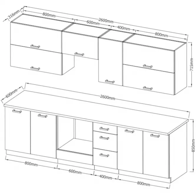 | Šírky spodných skriniek v zostave: | 80 + 60 + 40 + 80 cm |