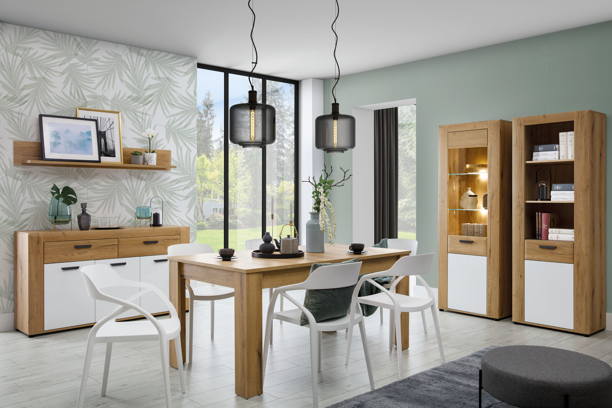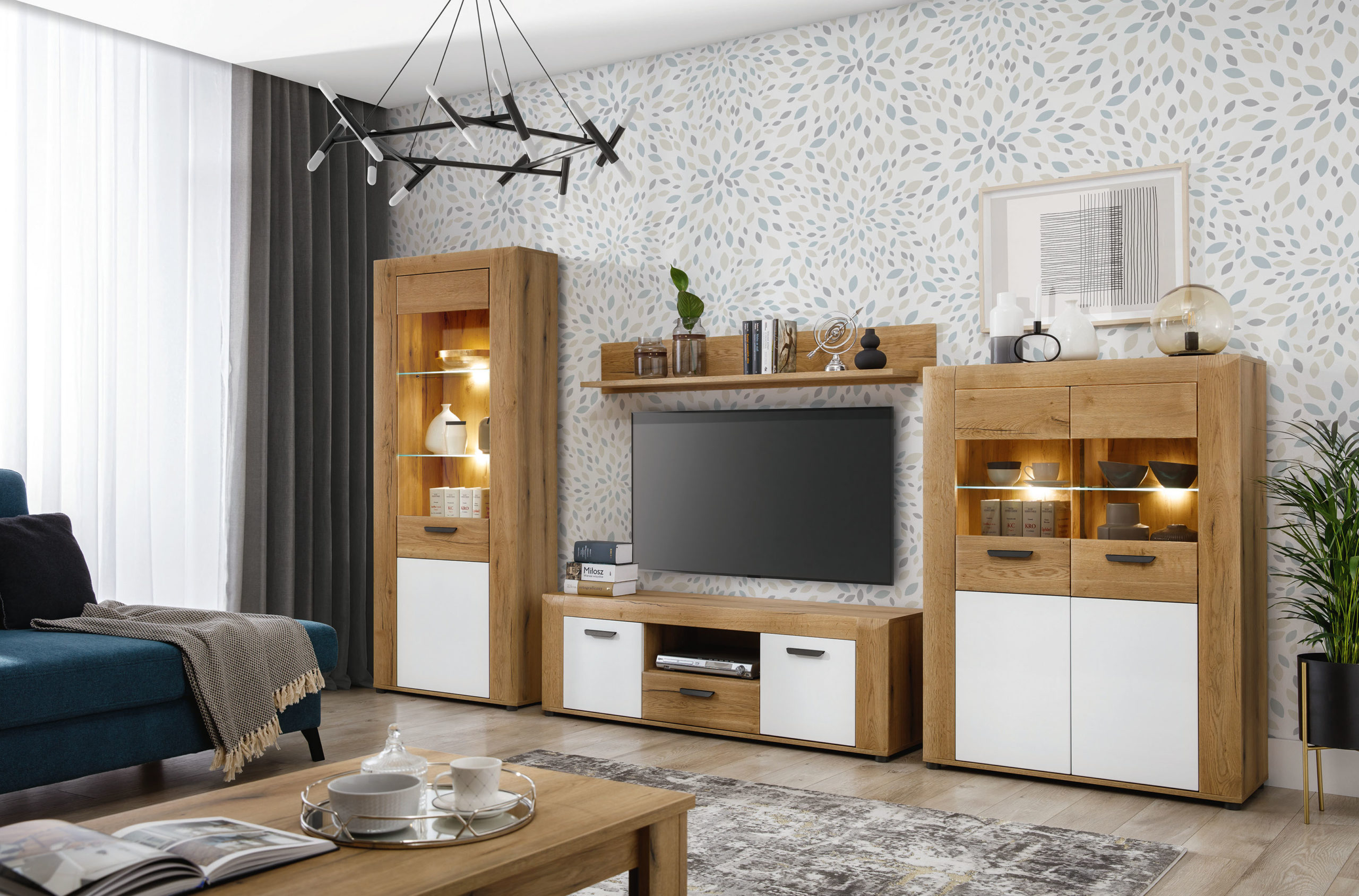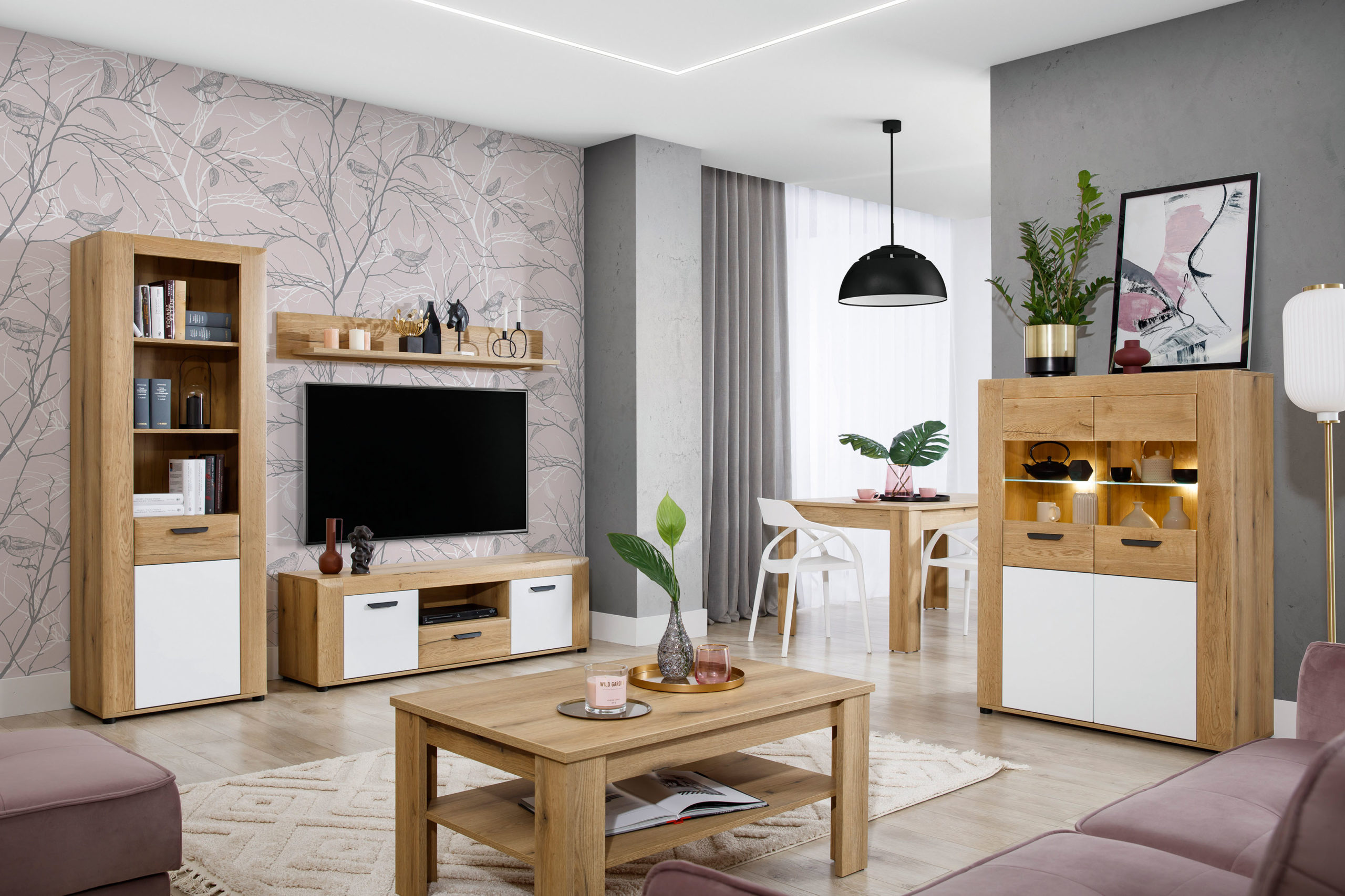 Ak hľadáte moderný, vkusný, kvalitný nábytok do Vašej obývačky, W ESTO je to čo potrebujete. Nábytok W ESTO je vyrobený z vysokokvalitných 16mm laminovaných drevotriesok v módnom dub evoke a obľúbenom alpskom bielom lesku prevedení. Veľkou výhodou tohto sektoru sú 1,5mm ABS hrany a tiež zásuvky s plným výsuvom – guľôčkové vedenie a použité tvrdené sklo.